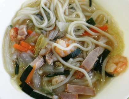 えび、焼き豚を主材にしたチャンポンです。でんぷんでとろみをつけています。