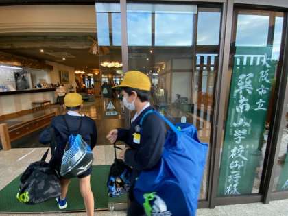 宿舎『みち潮』に到着しました。アルコール消毒をして入館して、これから開舎式です。