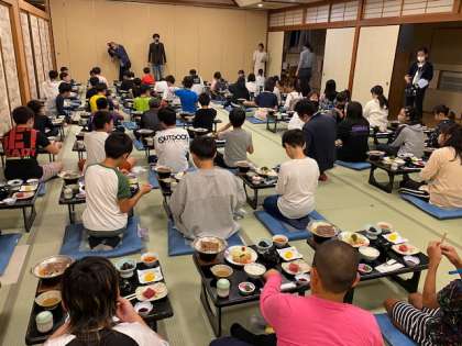 夕食を食べている様子です。感染症対策のため、みんな前を向いて食べています。
