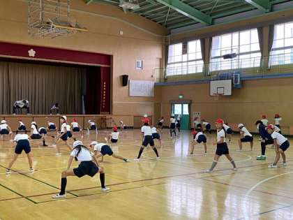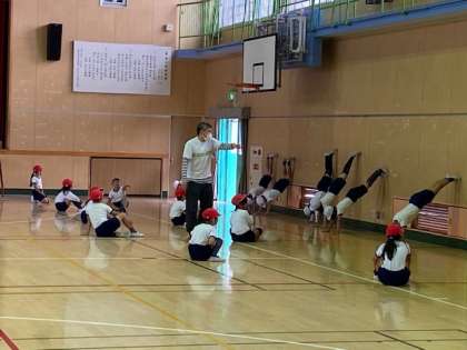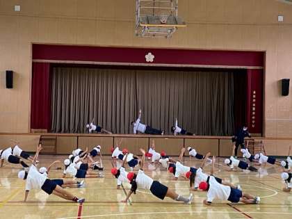 体ほぐしの運動や体のバランスをとる運動をしました。体つくり運動を通して運動の楽しさを身につけてほしいと思います。
