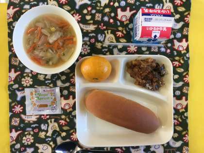 なすのミートグラタン、鶏肉と野菜のスープ、みかん、パン、アプリコットジャム、牛乳