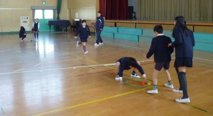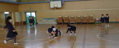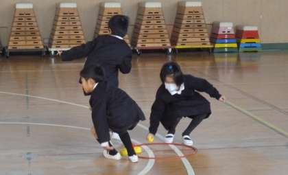 赤・黄・緑の玉を集め、玉と同じ色の野菜の名前をいいながら、頭と体を使って楽しくゲームをしました。