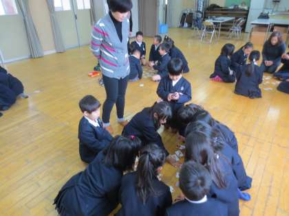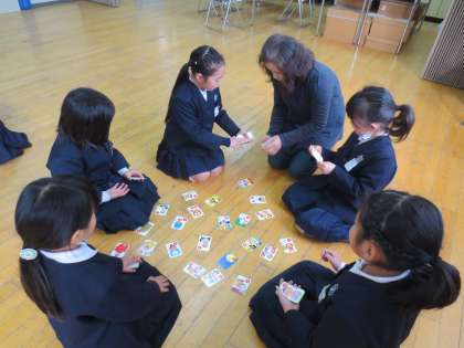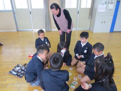 遊びを通して豊かな心を育てようと、「はぐくみネット」お手玉の会のみなさんが、心優しく接してくださっております。どの子も仲良くかるた遊びをしていました。