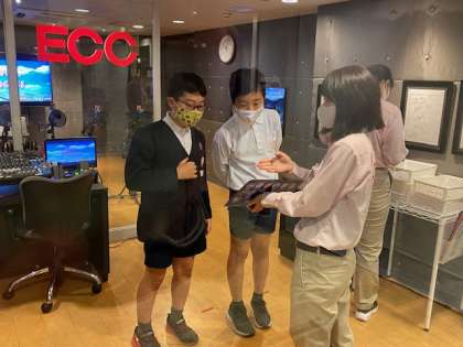ECCの声優になって、アニメーションにあわせて英語のセリフを吹き込むアフレコをするポストレコーディングスタジオです。