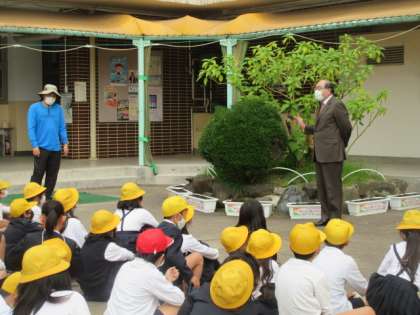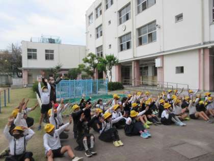 チューリップを植え終わってお話を聞きました。最後はみんなでバンザイしてチューリップが育つようにお願いしました。