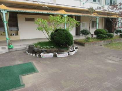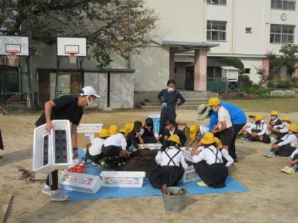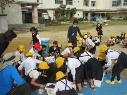 鉢植えに一人ずつ土を入れた後は、プランターにみんなで協力して土を入れて運びました。