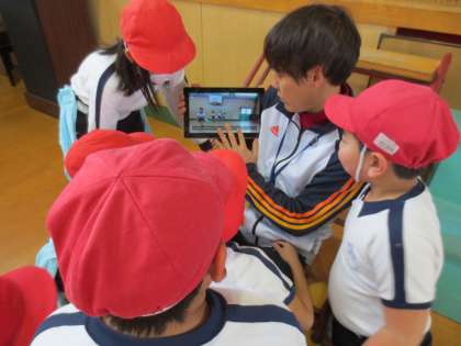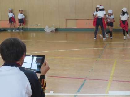 個々の「めあて」やチームプレーを高めるために、自分たちの動きを「タブレットPC」で振り返っています。