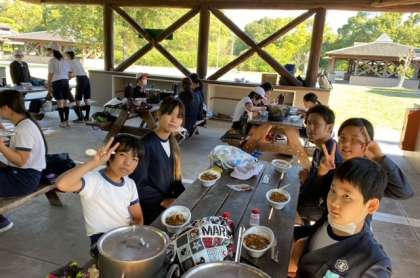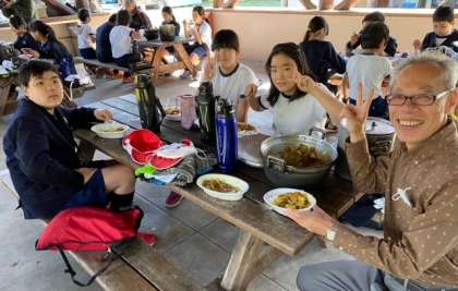 仲間とともに野外で食べるカレーの味は格別です。「おいしい」と笑顔が語っています。