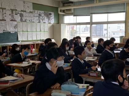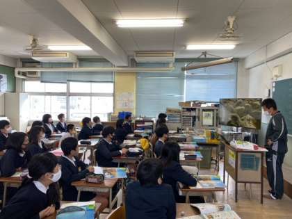 「大地のつくりと変化」の学習です。テレビの映像を見たあと、先生の話を真剣に聞いています。