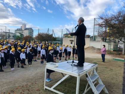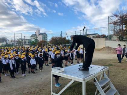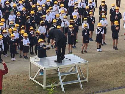 全校朝会です。子どもたちの集合がとても早いです。いいことです。