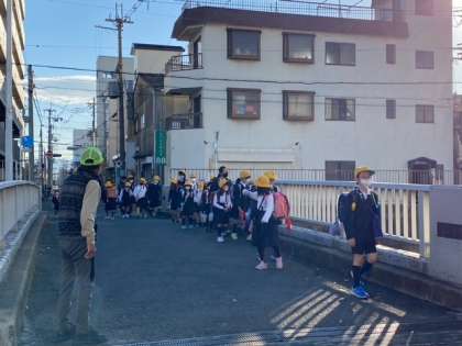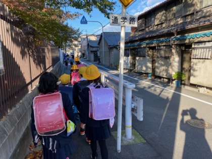 「集団登校で安全に学校に行こう」が週目標です。班長さんを中心に子どもたちが登校してきました。一列で歩いています。