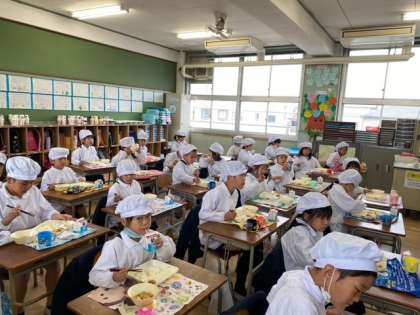 1年生の給食時間のようすです。よく噛んで味わいながら食べています。
