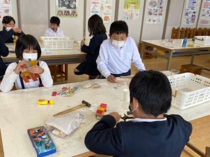 図工科で、「くぎ打ちトントン」という教材を使って、動物などをつくりました。