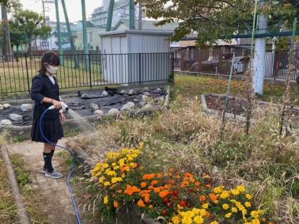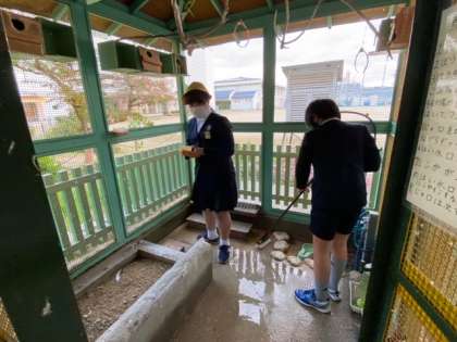 放課後、飼育栽培委員会の当番児童が鳥小屋と学習園の清掃や水やりをしていました。生き物を大切にする気持ちがよく表れています。