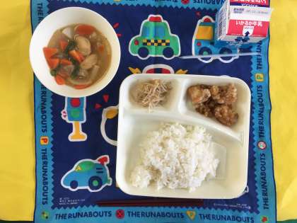 あげどりのねぎだれかけ、含め煮、もやしのピリ辛あえ、ご飯、牛乳