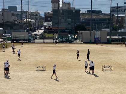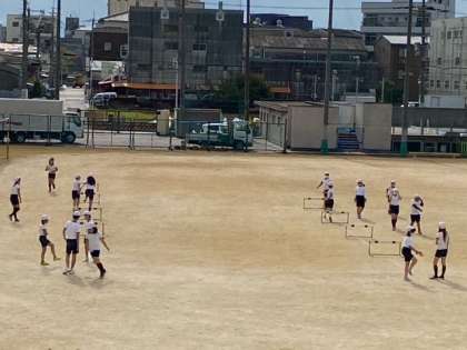 広く運動場を使い、体育の授業で「ハードル走」をしました。子どもたちが準備をしています。試走した後、ハードル走に挑戦しました。上手に跳ぶコツがつかめましたか。