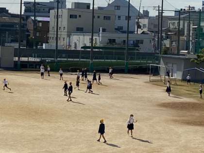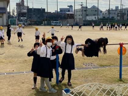 いいお天気です。子どもたちが、楽しそうに遊んでいます。鉄棒では、「前まわり」を披露してくれました。