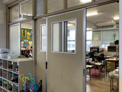 授業中や休み時間、状況に応じて換気をしています。2年生の教室のようすです。ドアや窓の一部を開放しています。