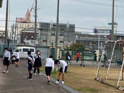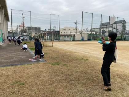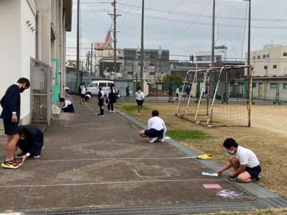 体育館わきで、5年生が算数の学習をしていました。「今日の授業風景4」で紹介した「平均」の実験学習です。区長さんが写真を撮られていました。
