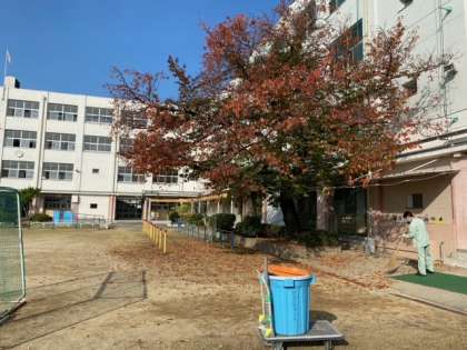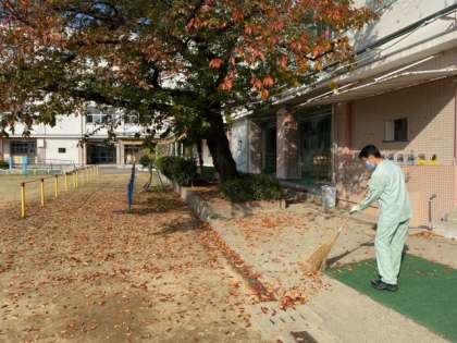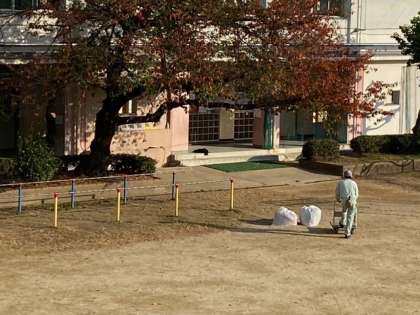 管理作業員さんが、運動場わきに散らばった「落ち葉」を掃いていました。休み明けで落ち葉がいっぱい、風が吹くと大変です。