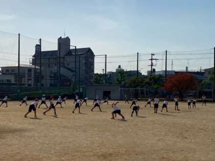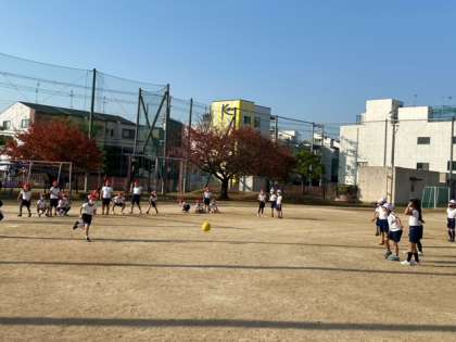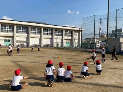 1組の子どもたちが、運動場で準備運動のあと「キックベースボール」をしました。外はポカポカ陽気です。
