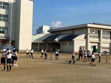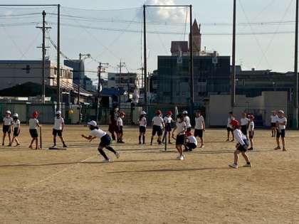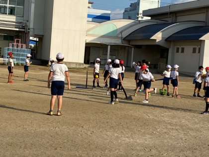暖かい陽ざしのなか、運動場を広く使い、ティーバッティングをしました。ボールをしっかりとらえて上手にとばしています。