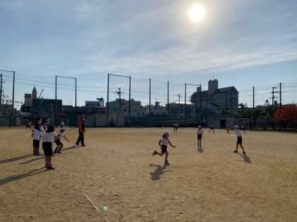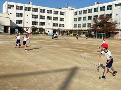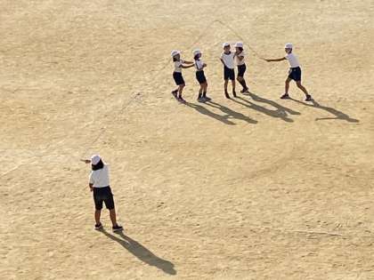 運動場全面が学習の場、広く使って「大なわとび」をしました。タイミングをはかって上手にくぐり抜けました。