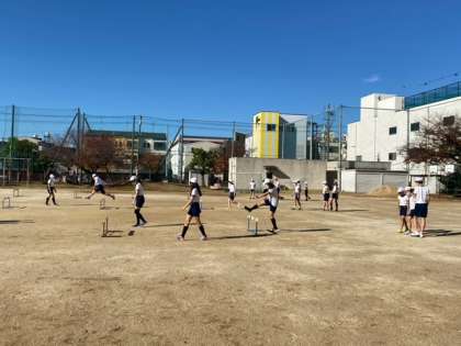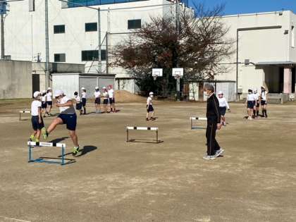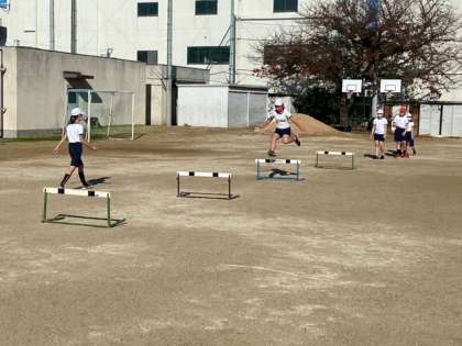 2組の子どもたちが、運動場でハードル走をしていました。かなり慣れてきたようです。