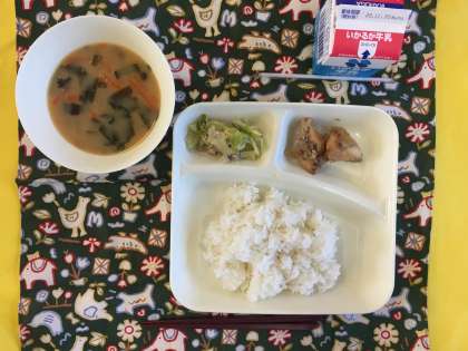鶏肉のごまだれ焼き、なめこのみそ汁、キャベツのいためもの、ごはん、牛乳