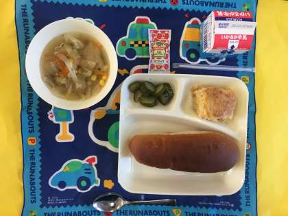 ツナポテトオムレツ、スープ、きゅうりのバジル風味サラダ、パン、牛乳