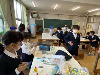 2組の図工科は「ギコギコクリエーター」のつづきです。木工作品ができあがりました。作業や片付けは班で協力して行いました。