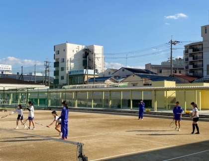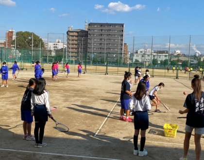 ラケットの使い方を先輩がやさしく教えてくれています。