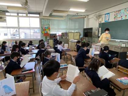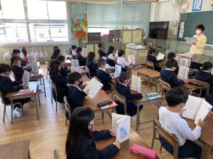 1組の国語科は、「思い出をかこう」の学習です。姿勢をよくして全員で教科書を音読していました。