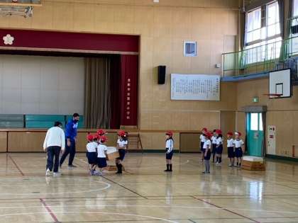 2組の体育科は、はじめてのとび箱です。先生の説明を聞いたあと、とび箱を運んでいます。