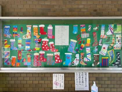 玄関の掲示板も12月に替わりました。子どもたちがつくった「長ぐつ」が飾られています。