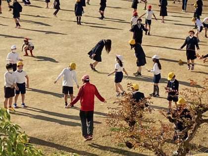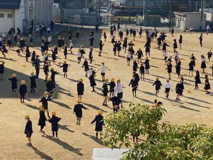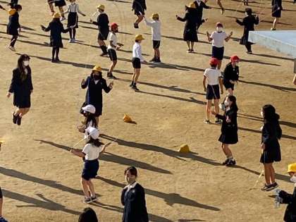 今日も、晴れ渡った空の下で、子どもたちが「なわとび」で体を動かしています。