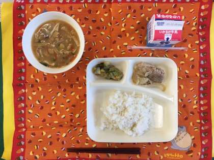 豚肉のしょうが焼き、さつまいものみそ汁、きくなとはくさいのごまあえ、ご飯、牛乳