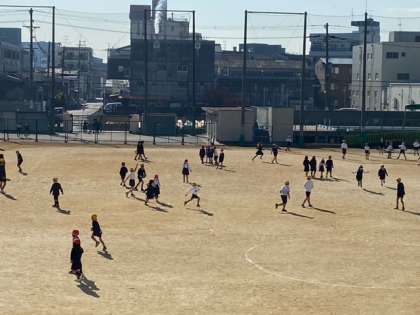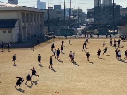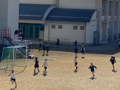 子どもたちが運動場で鬼ごっこやボール遊びをして楽しんでいます。なわとびをしている子もいました。
