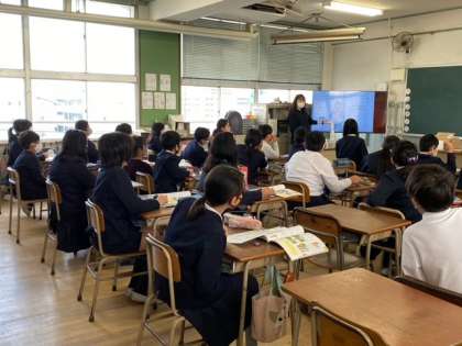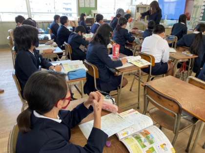 家庭科で、「衣服の働きを考えよう」です。季節によって、また、何をするかによって、衣服の着方をどう工夫するか考えて発表しました。