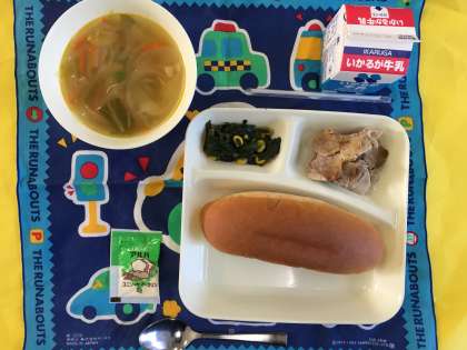 豚肉のガーリック焼き、スープ、ほうれんそうのソテー、パン、ソフトマーガリン、牛乳
