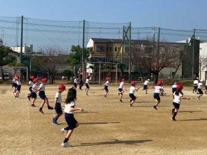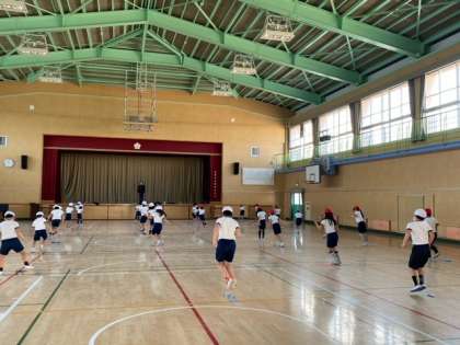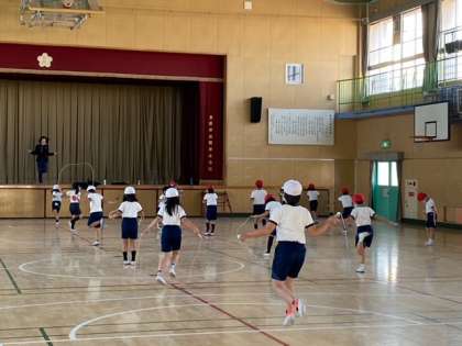 体育館と運動場にわかれて、なわとびをしました。先生の指示で「前跳び・駆け足跳び・……」次々にチャレンジしました。