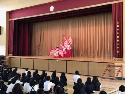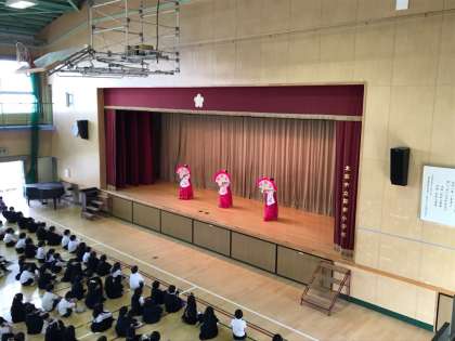 初めは、プチェチュム(扇の舞)です。華麗な踊りに児童から拍手がわきました。