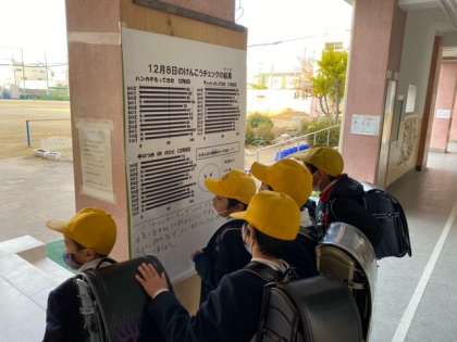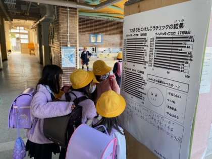 登校してきた子どもたちが、健康チェックの結果を見ています。