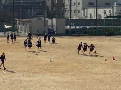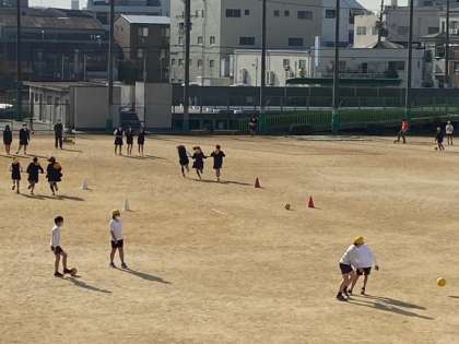 運動場で、ボール遊びや、なぜか?「台風の目」をして盛り上がっていました。担任の先生も温かく見守っています。