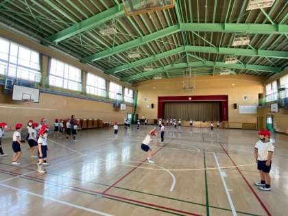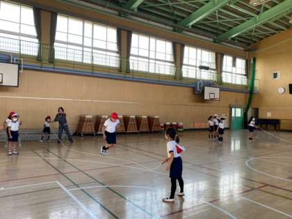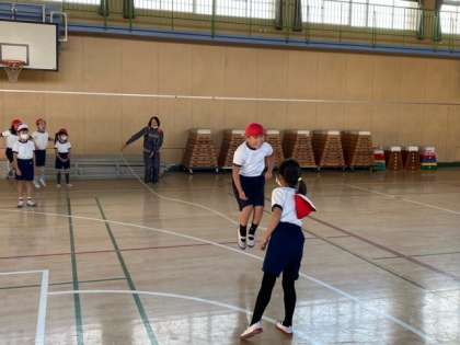なわとびをしました。個人で跳ぶ短縄はなく、長縄を使っています。縄を回旋させてくぐり抜けたり、縄の中で跳んだりしています。