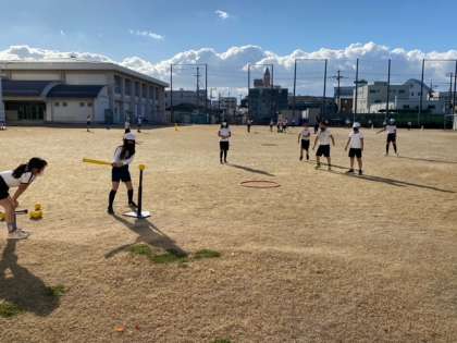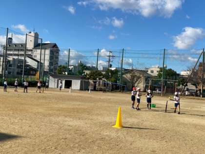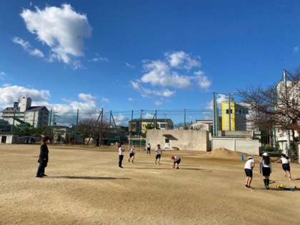 運動場で、ティーバッティングをしました。寒さも何のその、元気いっぱい運動しました。