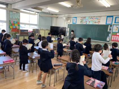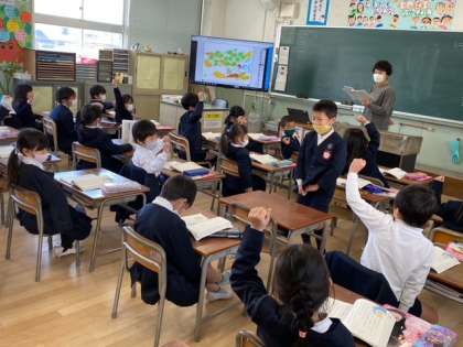 教科書をしっかりと読んでいます。先生の問いかけに、手を挙げて意見を発表しました。「同じ意見だよ」と何人かが「グー」のハンドサインをしています。
