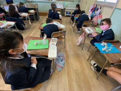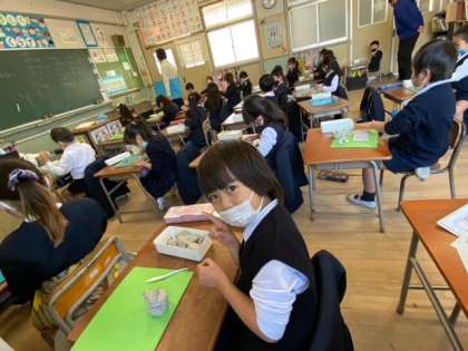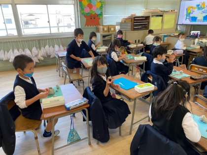粘土を使って「ふゆのもの」を作りました。雪だるまやトナカイ・(クリスマス)ケーキ・みかん・手袋など、子どもたちの「冬の世界」がいっぱいです。作ったものを見せてくれました。