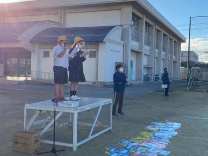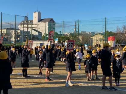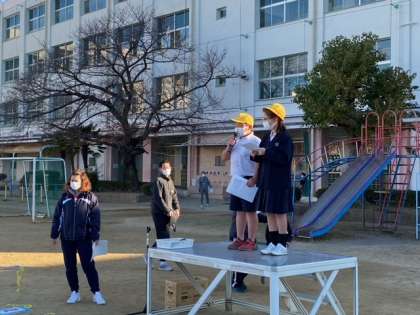 司会の児童が、ルールの説明をしています。今日のゲームは「あいこになるまで おわれまて〜ん」です。