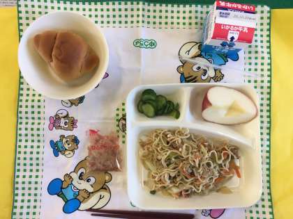 和風焼きそば、きゅうりの甘酢あえ、りんご、黒糖パン(小)、牛乳